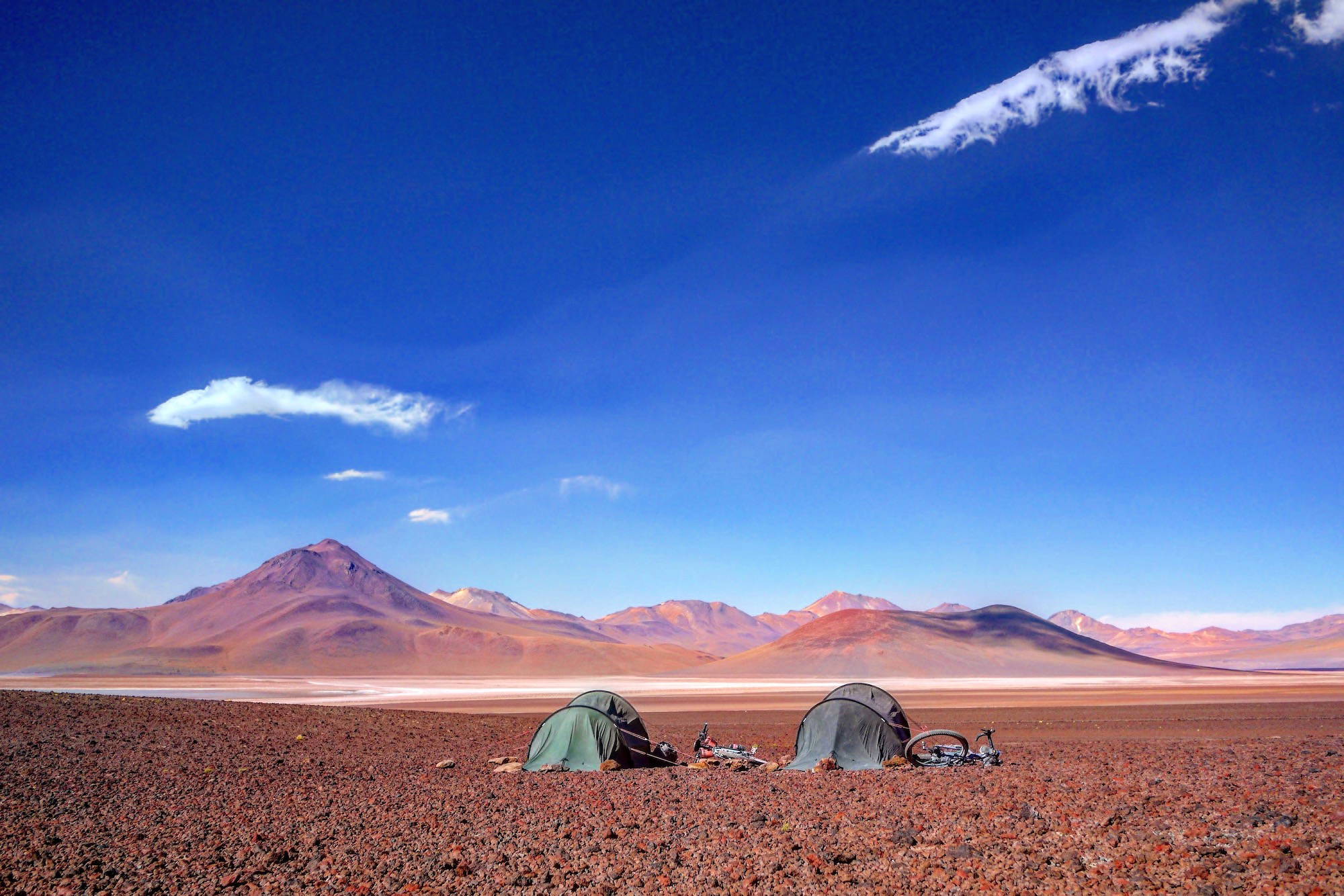 Each night we slept wild in our tents, wherever we could find a spot flat enough or sheltered enough to pitch them. 70% of the journey was on off-road dirt trails which led us up and over mountain passes at high as 5,900 metres in altitude, past crystal clear glaciers, through volcanic surrounds and alongside alpine lakes. We burrowed deep into sleeping bags in temperatures as low as -20C, endured dog bites, 50 mph cross-winds, running out of food, bike crashes and lovely bout of gastroenteritis. But we wouldn’t have changed it for the world. It was life at it’s most raw and most rich – just as it should be.
